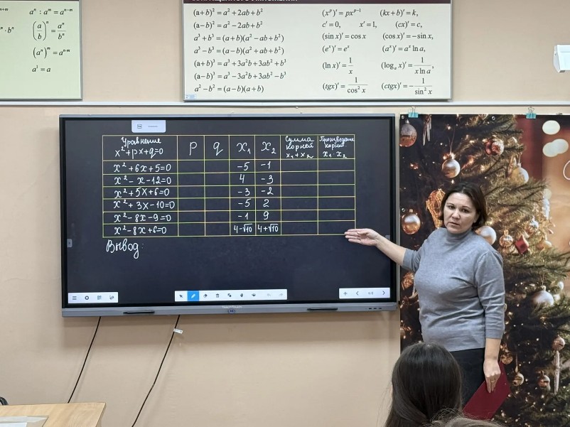 Ольга Викторовна Белая давала открытый урок на школьном уровне в 8 «В» классе. Тема урока «Теорема Виета».